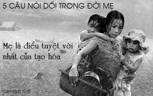 #10 5 Câu Nói Dối Trong Đời Mẹ 1. Cơm không đủ ăn, Mẹ nói: "MẸ KHÔNG ĐÓI!"2. Nhà nghèo, Mẹ nói: "MẸ KHÔNG THÍCH QUẦN ÁO MỚI!"3. Thức ăn ít, Mẹ nói: "MẸ KHÔNG THÍCH ĂN!"4. Thức khuya dậy sớm, Mẹ nói: "MẸ KHÔNG MỆT!"5. Kiệt sức vì mệt mỏi, Mẹ nói: "MẸ KHÔNG SAO!"